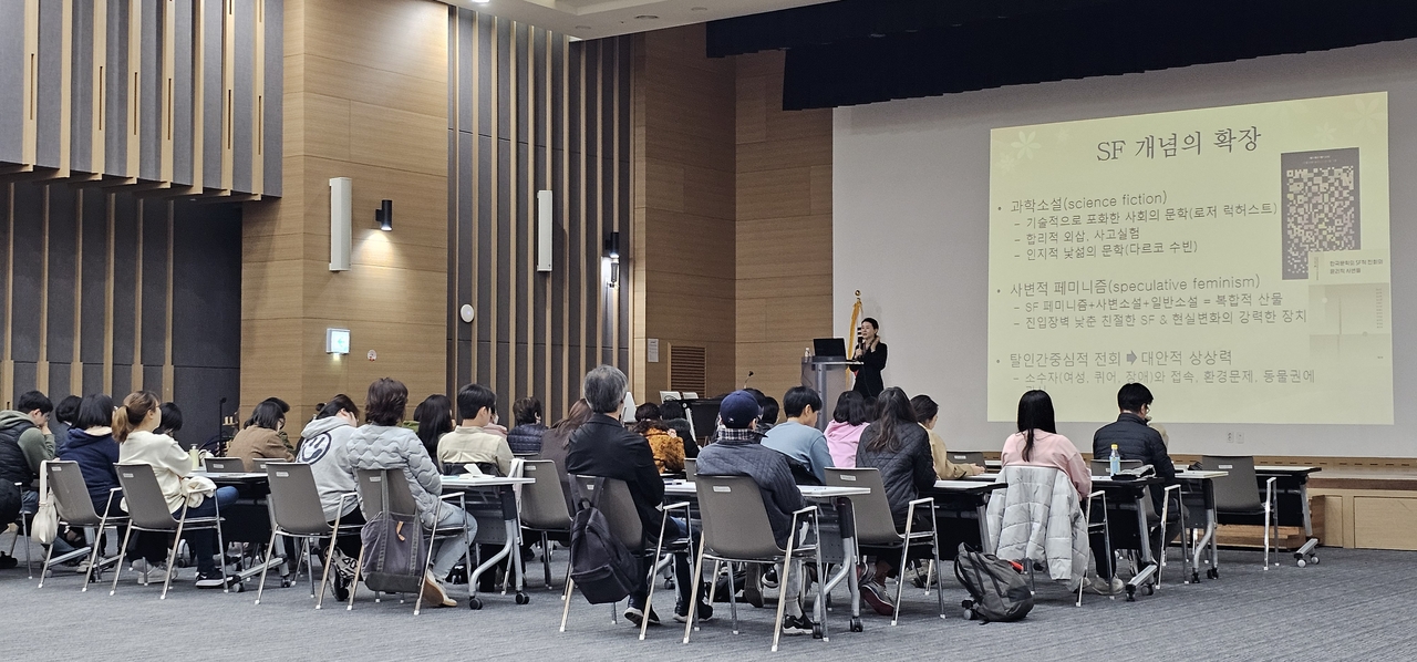 | 강당에서 강사가 프레젠테이션을 하고 있고, 여러 사람들이 의자에 앉아 강의를 듣고 있는 사진이다. 스크린에는 ‘SIP 개념과 확장’이라는 제목의 텍스트가 보이지만, 내용이 명확하게 보이지 않는다. |