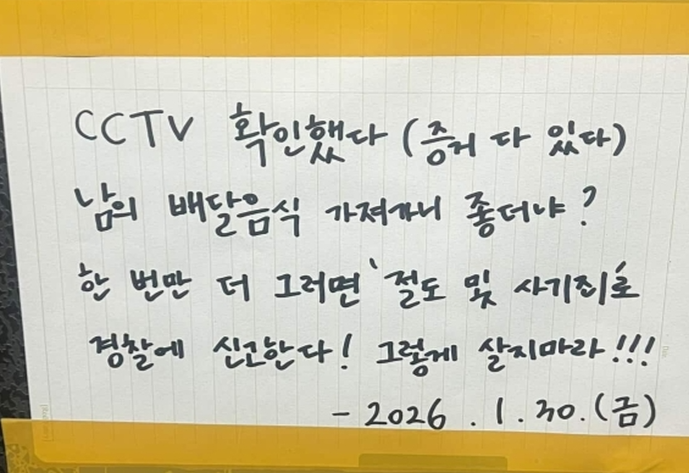 CCTV 영상에는 해당 배달 기사가 현관 앞에서 사진을 촬영한 뒤 음식을 들고 현장을 떠나는 모습이 고스란히 담겨 있었다. A씨는 이 증거를 바탕으로 아파트 게시판에 경고문을 부착했다.