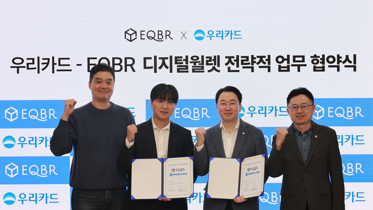 협약식은 이달 3일 우리카드 광화문 본사에서 유태현 우리카드 부사장, 정주영 디지털본부장 및 이현기 EQBR 대표, 정재건 사업 담당 이사 등 참석해 진행됐다.