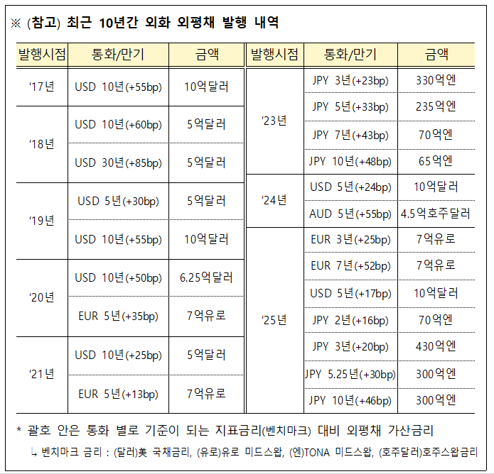 이번 발행을 통해 외환시장 안정판 역할을 하는 외환보유액도 선제적으로 확충했다. 발행 규모 30억달러는 단일 발행 기준으로 2009년 이후 최대 수준이다. 아울러 올해 9월과 10월에 만기가 도래하는 엔화·유로화 외평채 상환 재원도 미리 확보해 하반기 외화 수급 부담을 낮추는 효과도 기대된다.