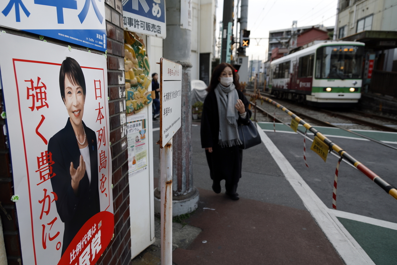 | 지난 5일 일본 도쿄에서 한 여성이 일본 총리 다카이치 사나에의 선거 운동 포스터를 지나가고 있다. [EPA] |