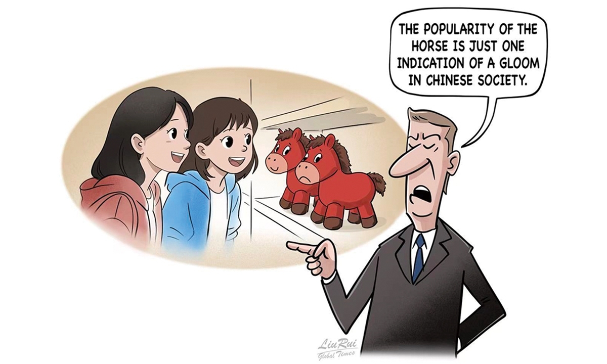 | “말 인형의 인기는 중국 사회 침체를 보여주는 한 단면일 뿐”이라고 말하는 서구 인사를 풍자적으로 그린 삽화. 중국 젊은이들이 ‘우는 말’ 인형을 즐기는 모습을 두고 서구 언론이 과도한 사회·경제적 의미를 부여하는 태도를 비판적으로 묘사했다. [글로벌타임스] |