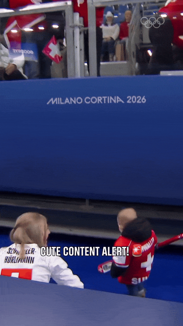이탈리아 코르티나담페초의 코르티나 컬링 올림픽 스타디움에서 5일 열린 컬링 믹스더블 1라운드 스위스와 에스토니아의 경기에서 ‘부부 선수’인 스위스의 위아니크 슈발러, 브리아어 슈발러-휘얼리만의 아들 리버가 경기장에 등장했다.