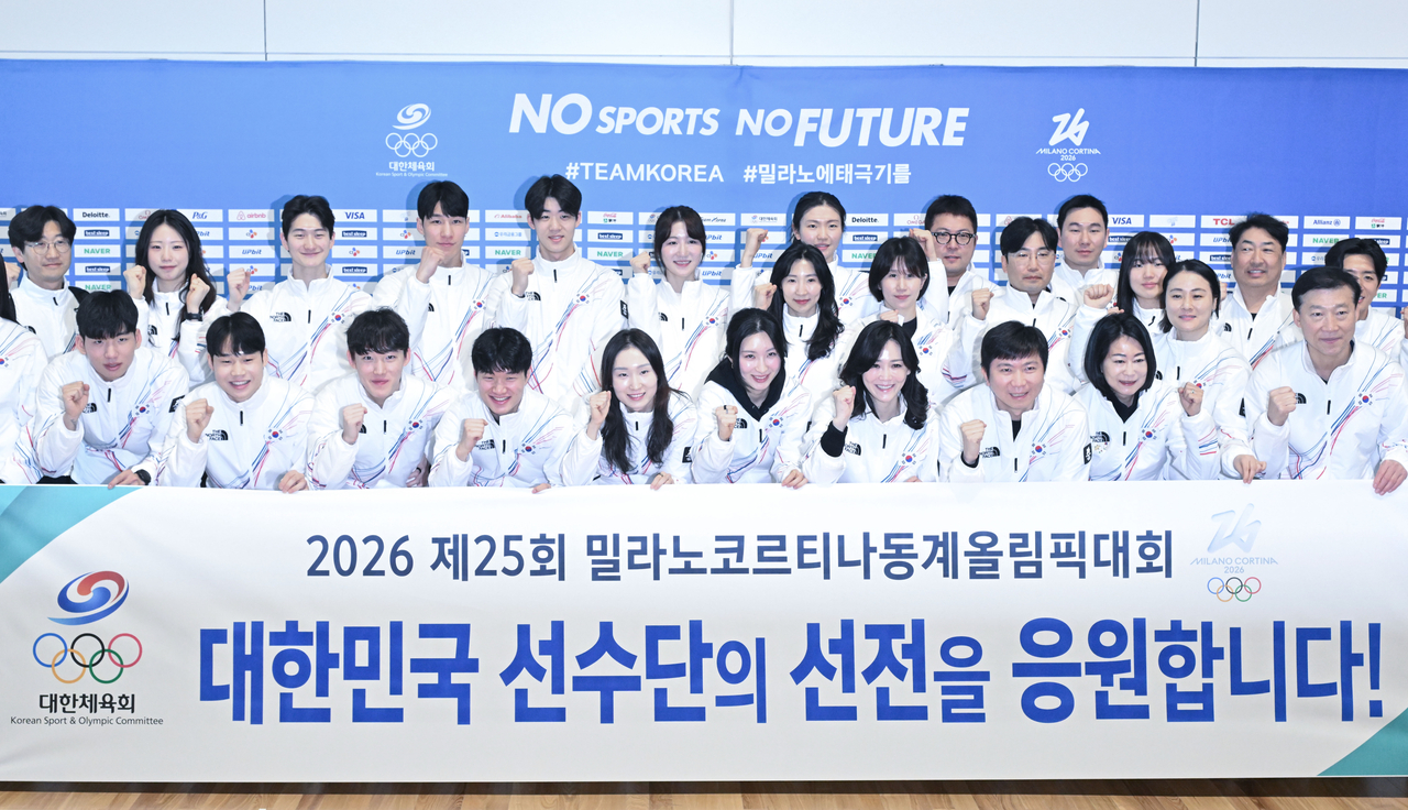 | 지난달 30일 오전 인천국제공항 제2여객터미널에서 유승민(첫째줄 오른쪽 세 번째) 대한체육회장과 김택수(젓째줄 오른쪽 첫 번째) 진천선수촌장, 이수경(첫째줄 오른쪽 네 번째) 선수단장을 비롯한 2026 밀라노·코르티나담페초 동계올림픽 국가대표팀 선수들이 출국 전 기념촬영을 하고 있다. [헤럴드경제 DB] |