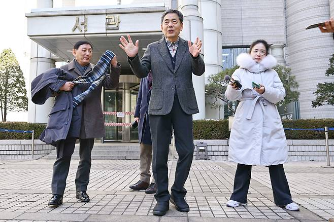 | 곽상도 전 의원이 6일 서울 서초구 서울중앙지방법원에서 열린 1심 선고를 마친 후 입장을 밝히고 있다. 이날 법원은 ‘대장동 50억 클럽’ 관련 범죄 수익을 은닉한 혐의를 받는 곽 의원에 대한 공소를 기각했다. [연합] |