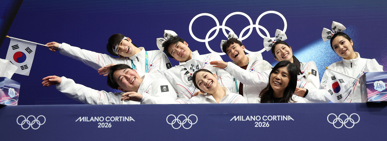 | 2026 밀라노·코르티나담페초 동계올림픽 개막일인 6일(현지시간) 이탈리아 밀라노 아이스스케이팅 아레나에서 열린 팀 이벤트 여자 싱글 쇼트프로그램에서 한국 신지아가 연기를 마친 뒤 점수를 기다리며 다른 선수들과 포즈를 취하고 있다. [연합] |
