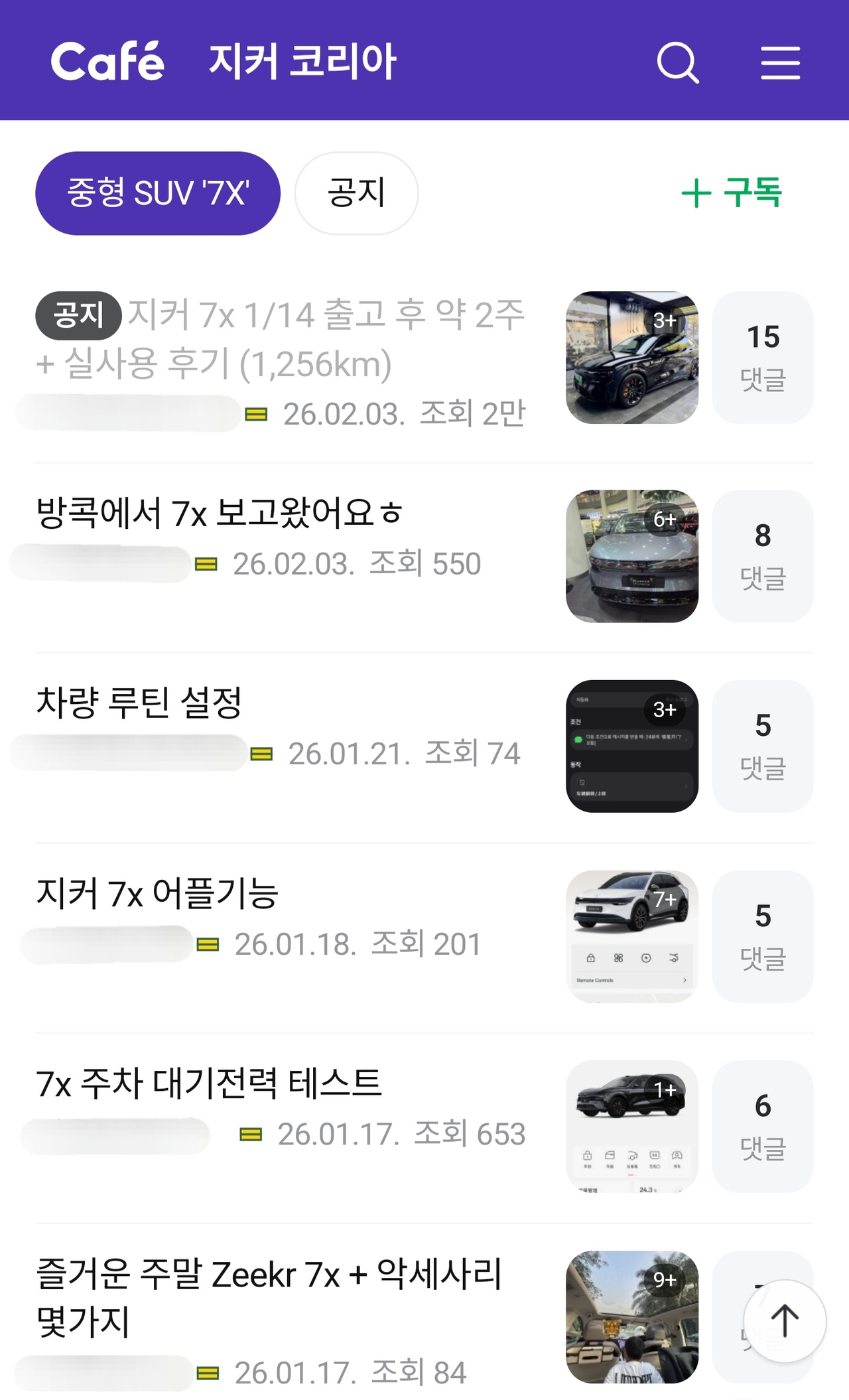 해당 팬카페에는 “여행 차 방문한 방콕의 쇼핑몰에서 7X뿐만 아니라 대형 SUV ‘9X’도 발견했다. 실내외 마감이 좋고, 오토도어 인식도 잘된다”, “중국 출고 후 사용 중인데 파워감 있고 부드러운 핸들링이 마음에 든다” 등 지커 차량과 관련한 게시글이 올라와 있다.