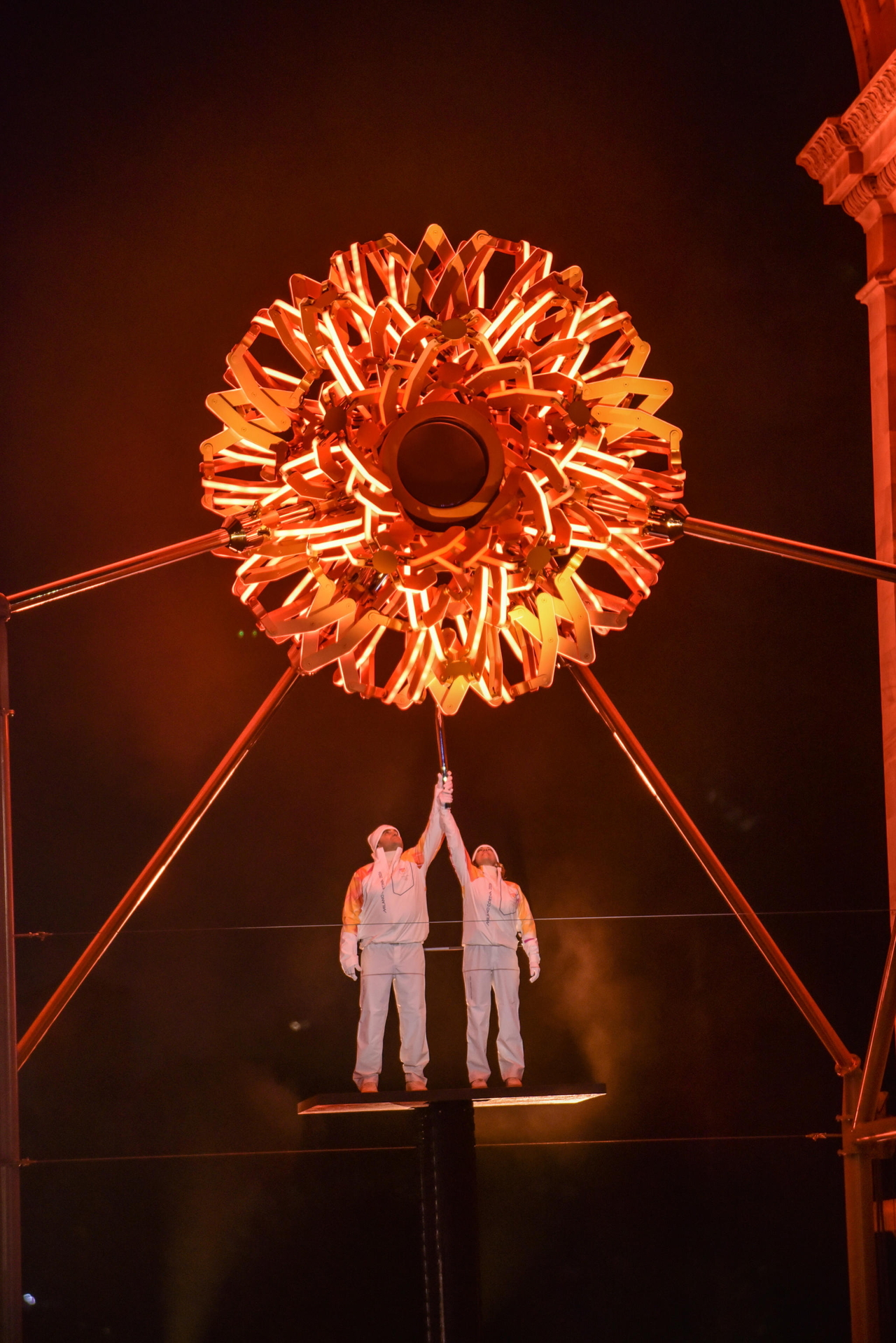 레오나르도 다빈치의 작품에서 착안한 구 형태로 만들어졌다. 최종 점화자의 성화봉이 구 형태의 성화대 중심에 불을 댕겼고, 성화대는 수축했던 심장이 부풀어 오르듯 커져 신기함을 자아냈다.