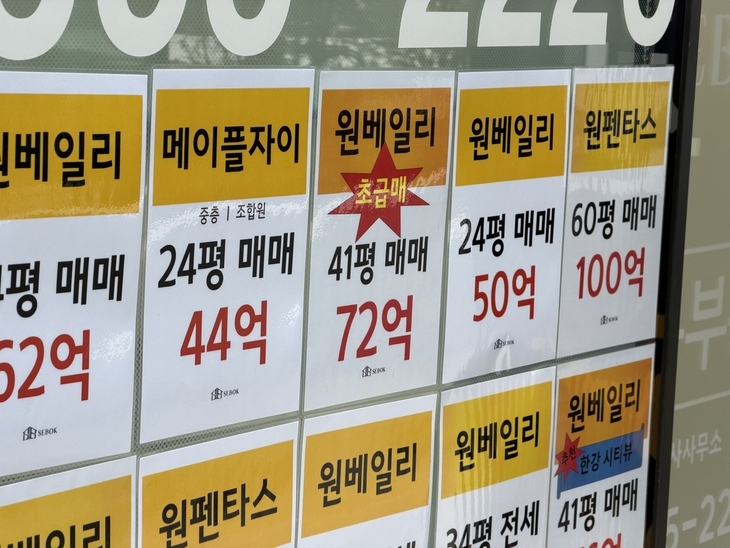 | 27일 찾은 서울 서초구 반포동 래미안원베일리 아파트 단지 내 공인중개사무소에 초급매 안내 광고지가 붙었지만 낙폭은 크지 않았다. 윤성현 기자 |