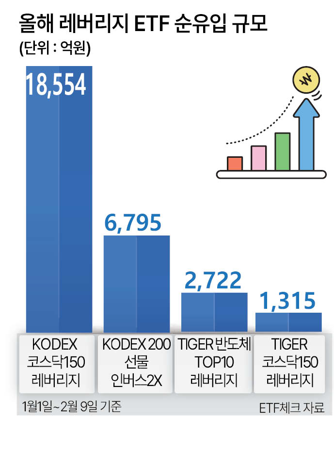 2배 레버리지 상품은 하락 이후 원금 회복을 위해선 하락률을 웃도는 반등이 필요하다. 급등락이 반복되는 변동성 구간에선 구조적으로 손실 가능성이 커진다. 예를 들어, KODEX 코스닥150레버리지는 1월 고점 부근에서 매수해 지난 6일까지 보유했을 경우 손실률이 20%대가 된다. 하지만 하락 과정에서 투자 원금이 감소, 다시 원금을 회복하려면 20%대가 아닌 30% 안팎의 상승세가 있어야 하는 식이다.