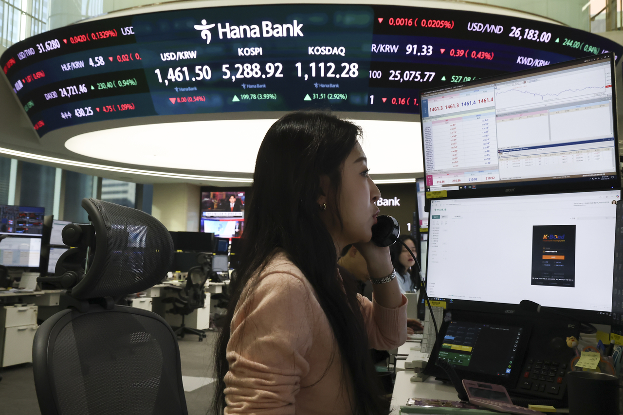 | 코스피가 4% 넘게 급등 출발한 9일 서울 하나은행 본점 딜링룸에서 딜러들이 업무를 보고 있다. [연합] |