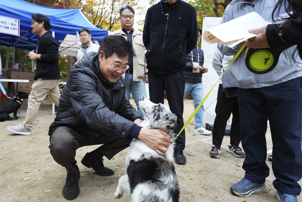 | 정문헌 종로구청장이 야외에서 강아지를 쓰다듬고 있는 모습이다. 정문헌 구청장은 안경을 쓰고 미소를 지으며 강아지를 바라보고 있다. |