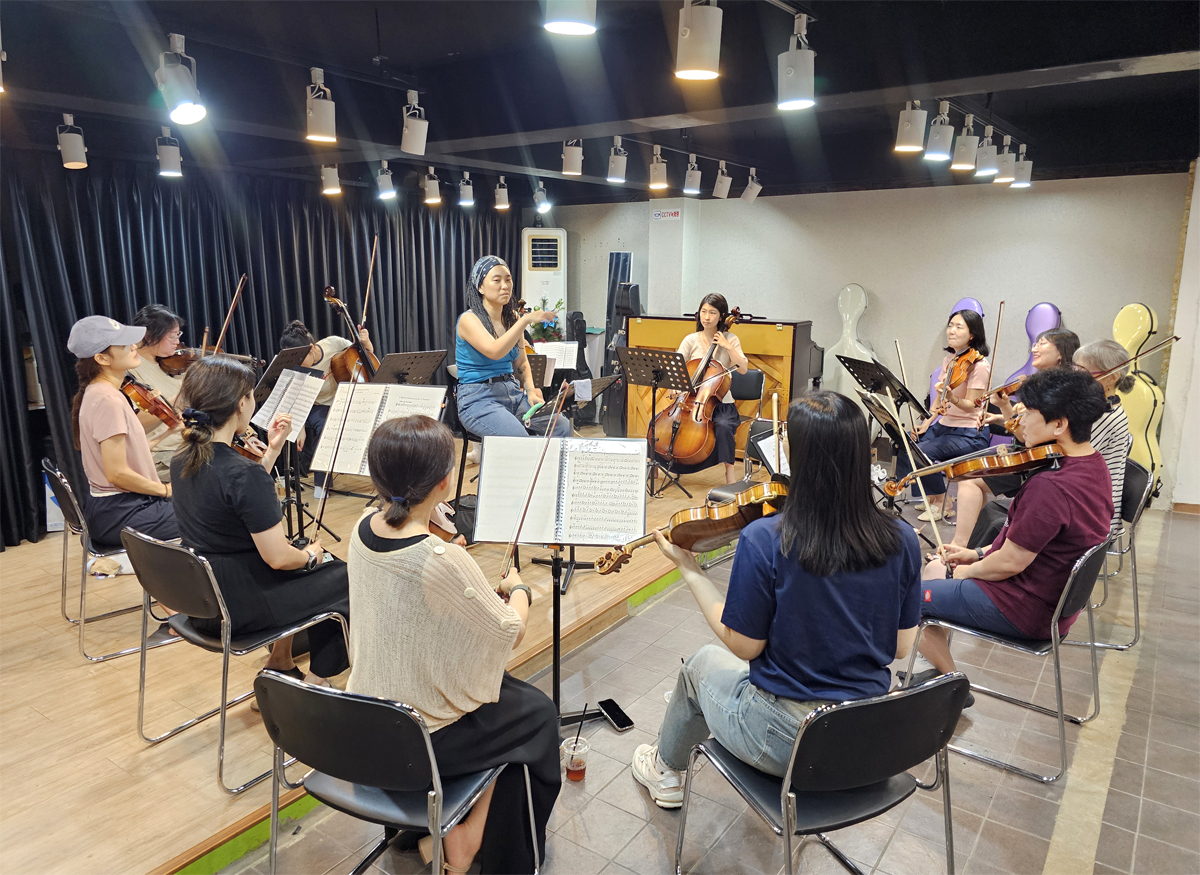| 실내에서 여러 사람이 바이올린, 첼로 등의 악기를 연주하고 있는 사진이다. 한 여성이 서서 손짓하며 연주를 지휘하고 있다. |