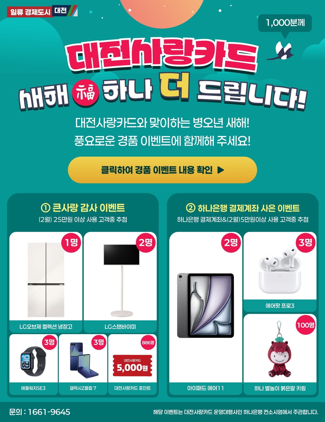 2월 한 달간 대전사랑카드를 25만 원 이상 사용한 고객 중 895명을 추첨해 1등 냉장고, 2등 스탠드형 TV 등 다양한 경품을 제공한다.
