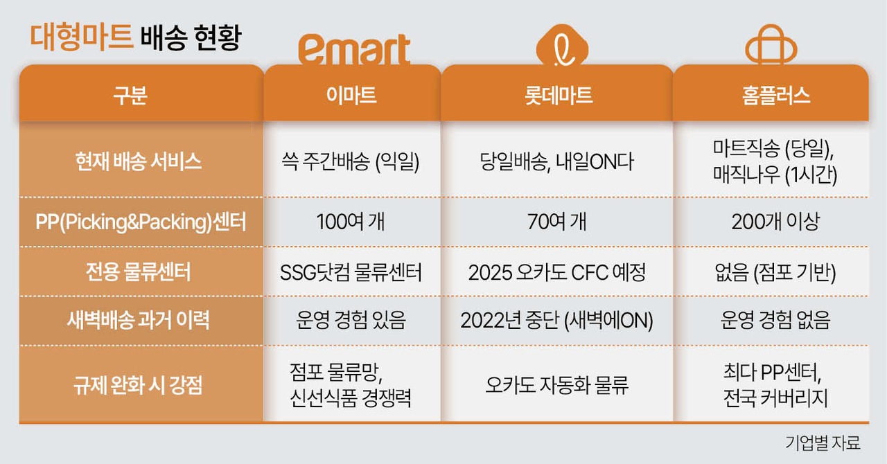 대형마트 업계는 온라인 배송 허용이 기울어진 운동장을 해소하는 효과가 있을 것으로 기대하고 있다. 당장 전국에 촘촘히 분포된 점포망을 새벽배송 거점으로 활용할 수 있다. 추가로 투입해야 하는 비용도 많지 않다. 또 쿠팡은 물류센터가 도심 외곽에서 떨어져 있고, 일부 지역은 아직 신선식품 새벽배송이 불가능한 상황이라 승산이 있다고 보고 있다. 다만 당·정·청이 추진하는 법 개정안이 온라인 배송만 허용한다는 점에서 ‘반쪽짜리’ 규제 완화에 그칠 수 있다는 우려도 나온다. 월 2회 의무 휴업 규제나 심야 오프라인 영업 제한은 유통법 일몰 시한이 연장되며 2029년까지 유지된다.