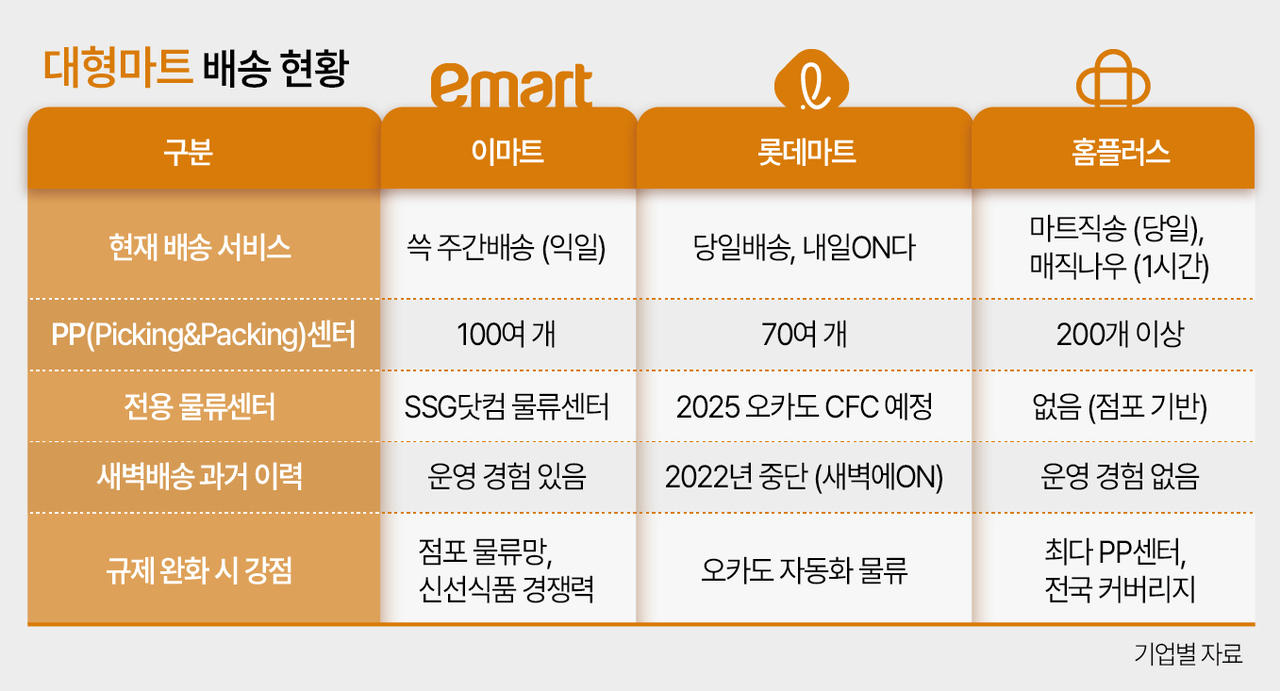 대형마트 업계는 온라인 배송 허용이 기울어진 운동장을 해소하는 효과가 있을 것으로 기대하고 있다. 당장 전국에 촘촘히 분포된 점포망을 새벽배송 거점으로 활용할 수 있다. 추가로 투입해야 하는 비용도 많지 않다. 또 쿠팡은 물류센터가 도심 외곽에서 떨어져 있고, 일부 지역은 아직 신선식품 새벽배송이 불가능한 상황이라 승산이 있다고 보고 있다.