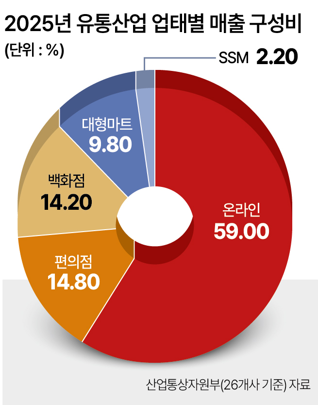 산업통상부에 따르면 지난해 주요 26개 유통업체 가운데 온라인 부문의 비중은 역대 최고인 59.0%까지 늘어난 반면, 대형마트는 9.8%로 추락하며 사상 처음 10%를 밑돌았다. 2021년부터 지난해까지 최근 5년간 추세를 보면, 온라인은 연평균 10.1% 증가한 반면 대형마트는 매출이 4.2% 감소했다. SSM(기업형슈퍼마켓)도 1.0% 성장에 그쳤다.