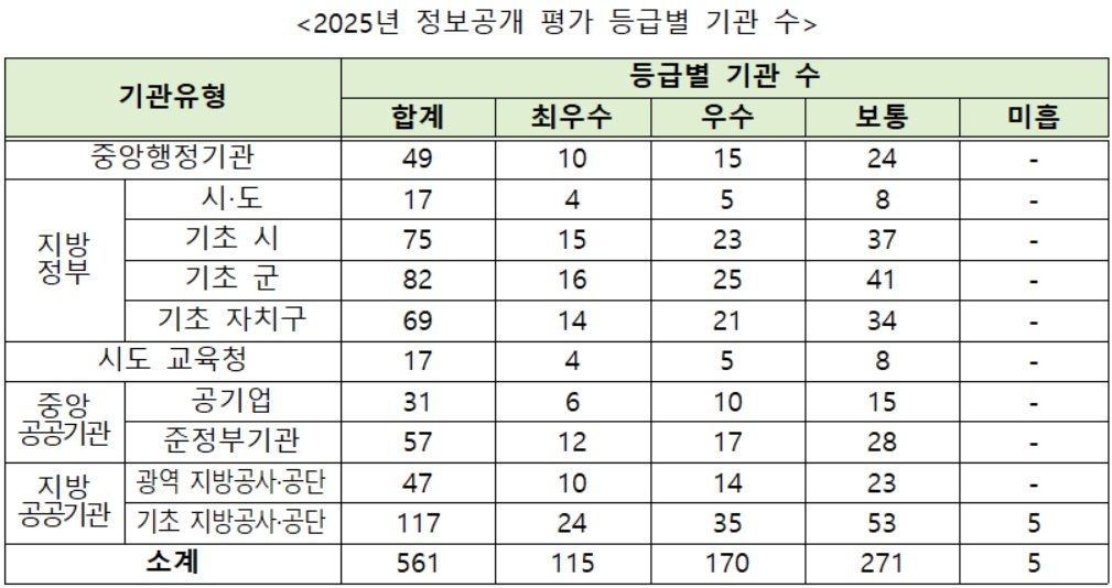 2025년도에는 총 561개 기관을 대상으로 ▷사전정보공표 ▷원문공개 정보 ▷정보공개 청구처리 ▷고객관리 ▷제도운영 총 5개 분야를 평가했다.