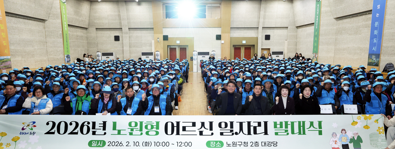 | 실내 강당에서 많은 사람들이 모여 ‘2026년 노원형 어르신 일자리 발대식’이라고 적힌 현수막 앞에서 사진을 찍고 있는 모습이다. 참가자들은 파란색 조끼와 모자를 착용하고 있으며, 일부는 주먹을 쥐고 있다. |