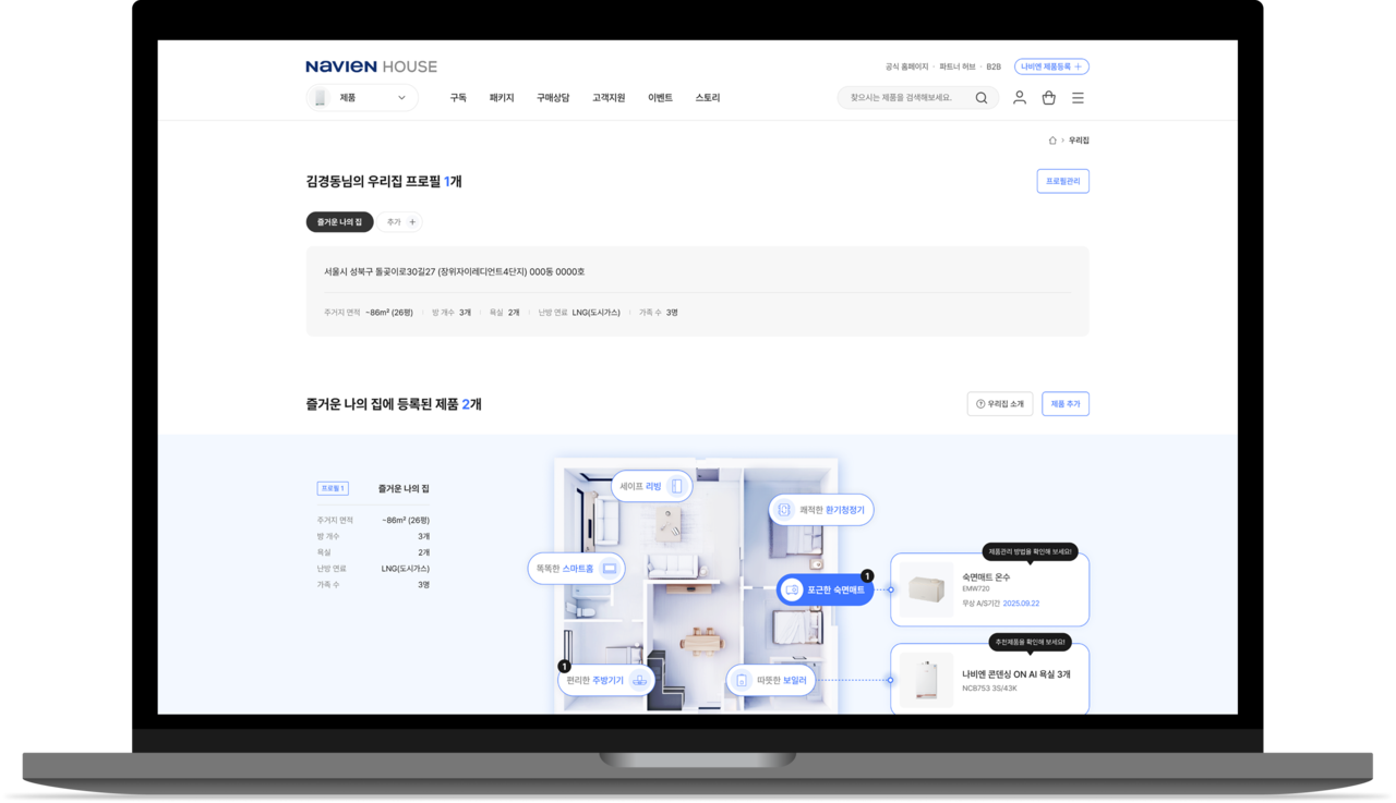 이번 개편의 핵심은 고객 맞춤형 추천 기능인 ‘우리집’이다. 사용자가 주거 면적과 구조 등 공간 정보를 입력하면 해당 환경에 적합한 보일러, 제습 환기청정기, 숙면매트 등을 자동으로 추천한다. 기존처럼 개별 제품을 비교 검색해야 하는 과정을 줄이고, 거주 환경 중심의 통합 선택이 가능하도록 설계됐다.