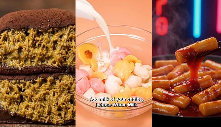 | 쫄깃한 식감을 가진 K-푸드가 글로벌 트렌드와 한류의 영향으로 주목받고 있다. (왼쪽부터) 두쫀쿠, 꿀떡 시리얼, 떡볶이 [SNS 캡처, 123RF ] |