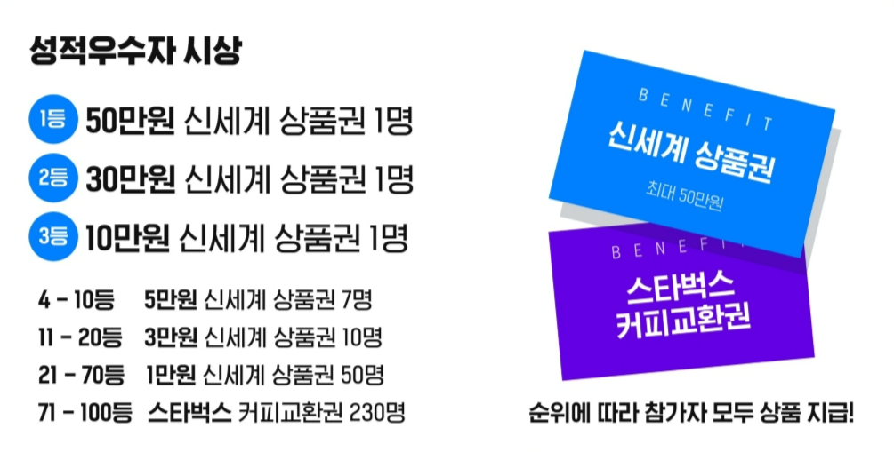 골든벨 행사는 3월 17일부터 19일까지 총 4회차에 걸쳐 화상 회의 플랫폼(Zoom)을 통해 진행한다. 성적 우수자에게는 ▷1등 50만원 ▷2등 30만원 ▷3등 10만원 등 총 300명에게 신세계 상품권과 커피 교환권을 제공한다.