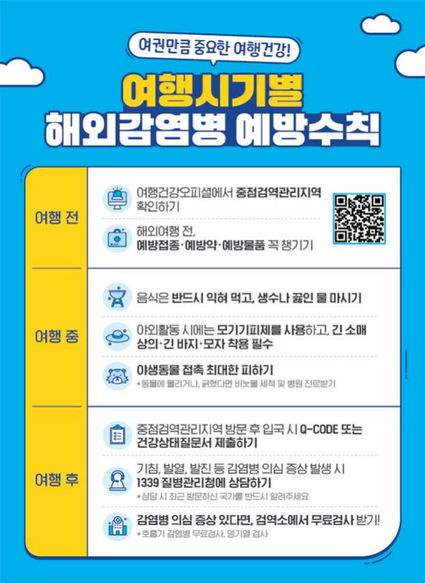 설 연휴에도 질병관리청 콜센터(☎1339)와 구·군 보건소에서 감염병 신고 및 상담이 가능하며, 시도 24시간 감염병감시체계를 가동하고 있다. 각종 해외감염병에 대한 정보는 ‘해외감염병나우(NOW)’ 누리집(해외감염병NOW.kr)과 ‘여행건강 오피셜’(travelhealth.kr)에서 확인할 수 있다.