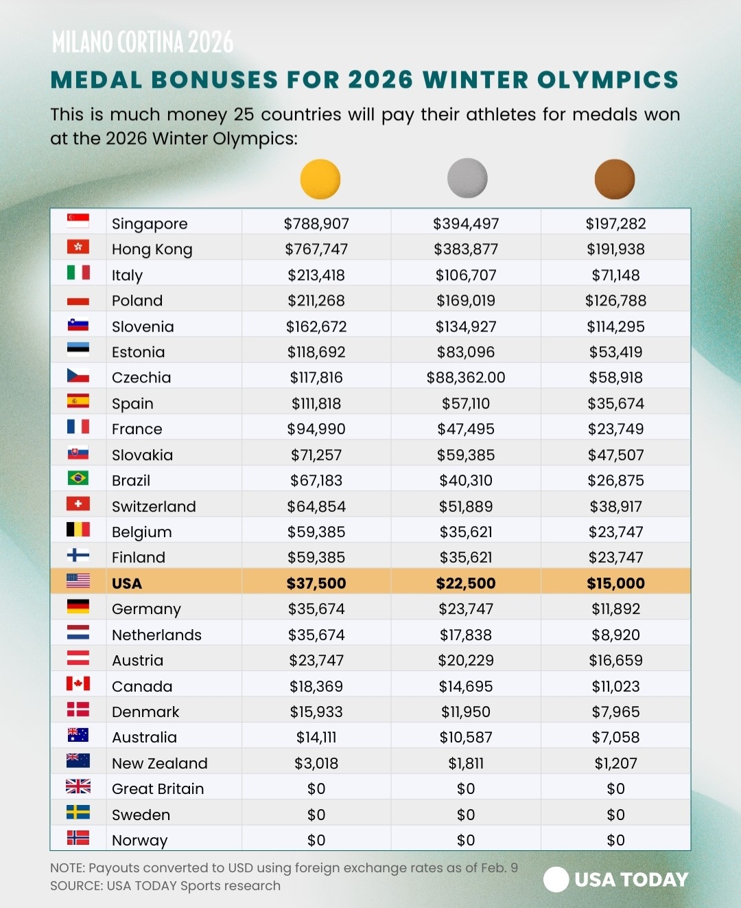 미국은 미국 올림픽 및 패럴림픽 위원회의 ‘오퍼레이션 골드 어워즈’(Operation Gold Awards)를 통해 금메달 3만7500달러(약 5463만원), 은메달 2만2500달러(약 3278만원), 동메달 1만5000달러(약 2185만원)를 지급할 예정이다. 이는 2022년 베이징 동계 올림픽과 2024년 파리 올림픽에서 지급된 것과 동일하다.