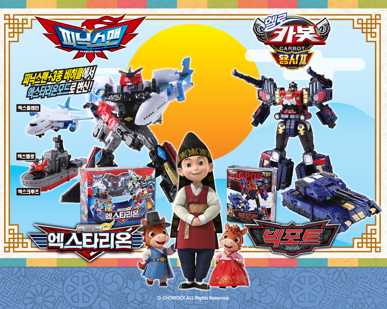 | 콘텐츠 전문 기업 초이락컨텐츠컴퍼니(대표 최종일, 이하 초이락)이 설 연휴를 맞아 새 애니메이션 시리즈인 ‘피닉스맨’과 ‘헬로카봇 시즌17(용사2)’ 브랜드를 대표하는 ‘특급’ 완구 2종을 선보인다. [초이락컴퍼니] |