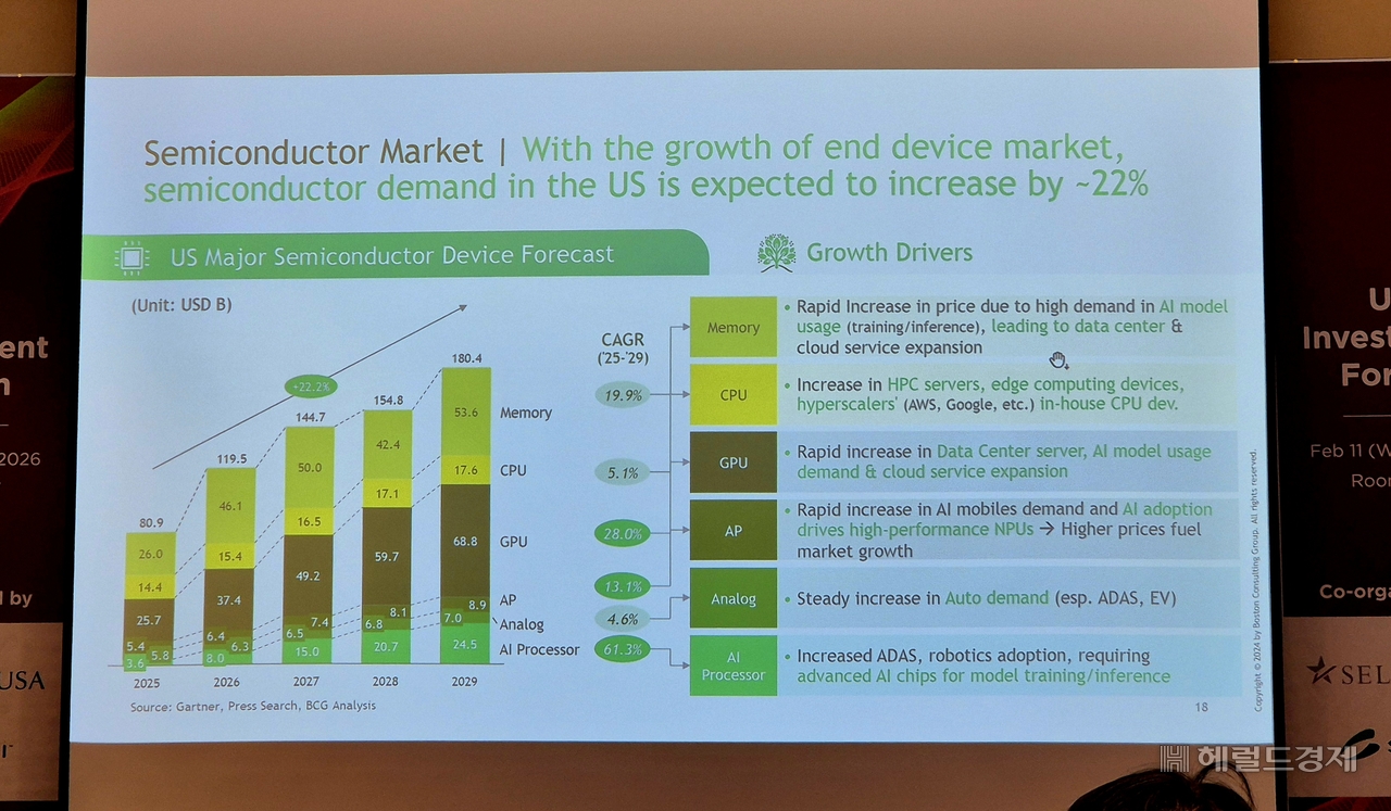 | 이동환 보스턴컨설팅그룹 시니어 매니저가 11일 서울 강남구 코엑스에서 열린 ‘세미콘 코리아 2026 : 미국 투자 포럼’에서 제시한 미국 반도체 시장 전망. 김현일 기자 |