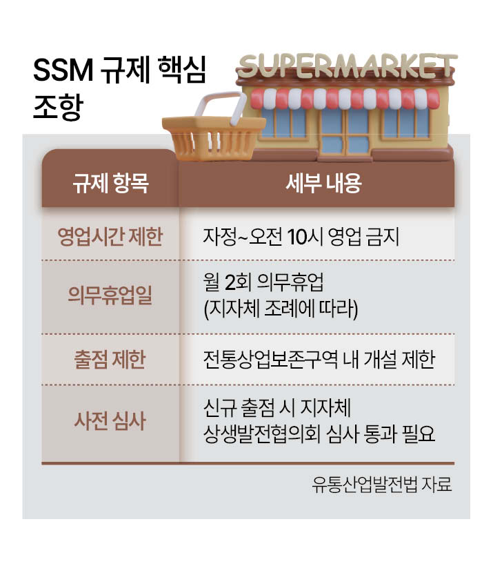 업계에서는 SSM 가맹점 규제 완화가 지역 오프라인 상권을 되살리는 계기가 될 것이란 목소리도 나온다. 한 업계 관계자는 “새벽배송의 등장 이후 전통시장 등 지역 상권이 아닌 이커머스 중심으로 고객들이 대거 이동하는 불균형이 가속화하고 있다”며 “SSM의 오전 영업시간 규제 완화는 지역 상권의 장보기 수요를 회복시킬 수 있을 것”이라고 말했다.