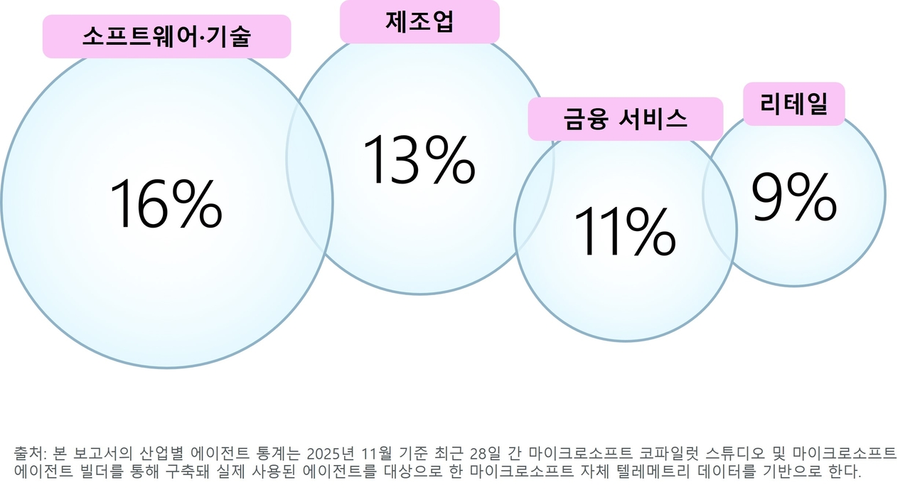 이에 MS는 올해를 ‘AI 에이전트 해’로 전망했다. 실제로 AI 기반 자동화가 산업 전반으로 확산하고 있다. 산업별로 활성 에이전트 비중은 소프트웨어·기술 16%, 제조업 13%, 금융서비스 11%, 리테일 9% 등으로 집계됐다.