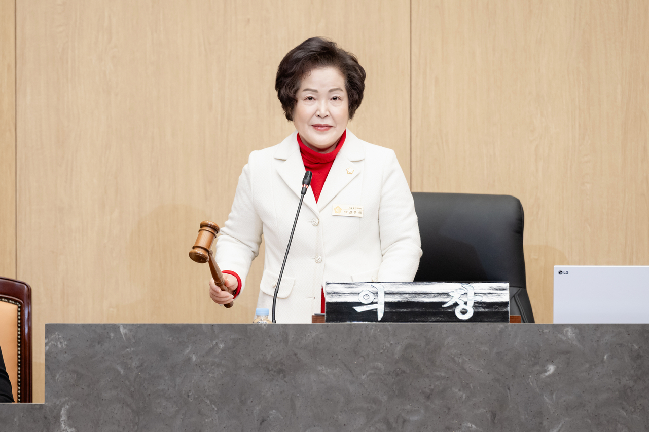 | 밝은 표정의 전은혜 광진구의회 의장이 의사봉을 들고 있는 사진이다. 흰색 정장을 입고 마이크 앞에서 의사봉을 들고 정면을 응시하고 있다. |