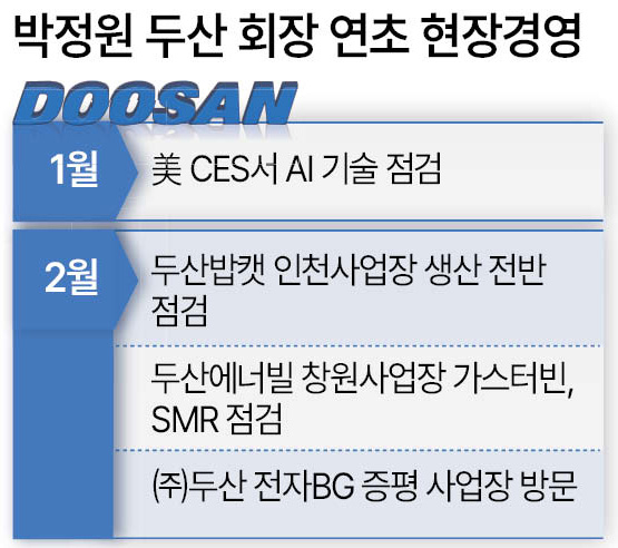 박정원 두산그룹 회장이 연초부터 활발한 현장 경영을 펼치고 있다. 글로벌 시장에서 주목받고 있는 두산의 가스터빈과 소형모듈원전(SMR), 동박적층판(CCL) 등의 생산 현황을 두루 살피며 새 사업 기회를 모색한 것이다. 특히 빠르게 도래 중인 인공지능(AI) 시대에 맞춰 에너지 등 관련 사업에서 더 큰 도약을 노릴 수 있도록 직접 지휘에 나선 것이라는 분석이다.