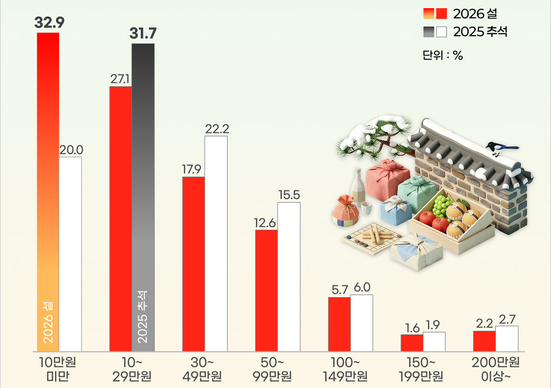 선물 예산 역시 부담을 낮추려는 움직임이 보였다. 설 선물 예상 비용으로 ‘10만 원 미만’(32.9%)이 가장 많았다. 전반적으로 실용성과 부담 완화를 고려한 선택이 늘어난 모습이다.