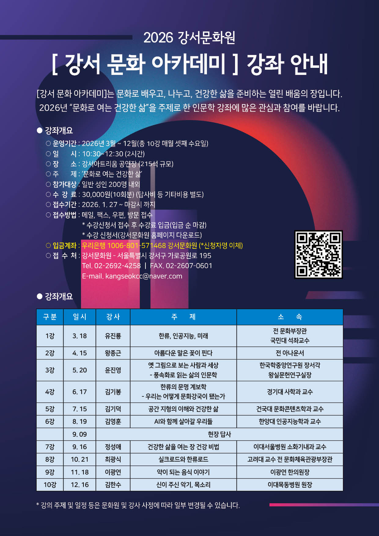 | 2026 강서 문화 아카데미 강좌 안내 포스터 사진이다. 포스터에는 강좌 개요, 강사, 주제 등이 표 형식으로 정리되어 있다. |