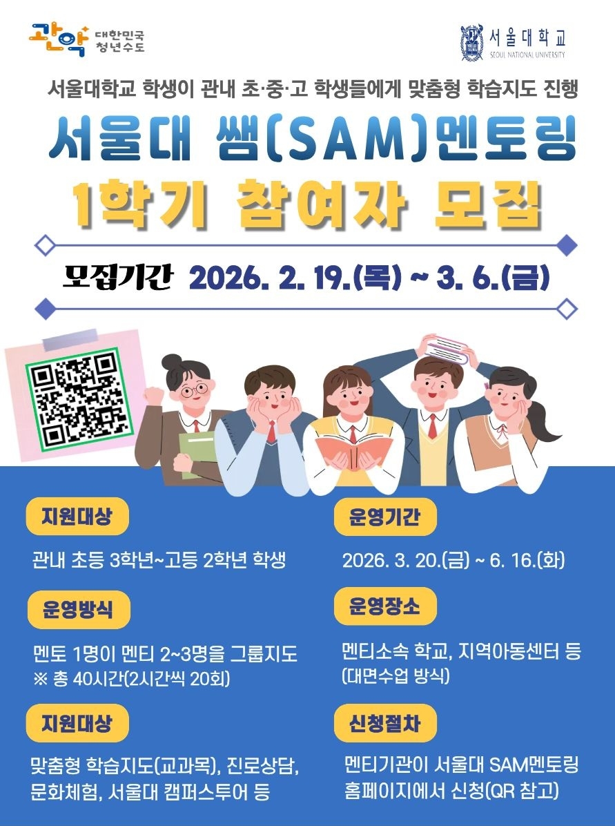2026년도 1학기 멘토링 참여를 희망하는 기관(관내 초중고교, 지역아동센터 등)은 서울대 쌤(SAM) 멘토링 홈페이지를 통해 신청할 수 있다. 모집기간은 오는 2월 19일부터 3월 6일까지다.