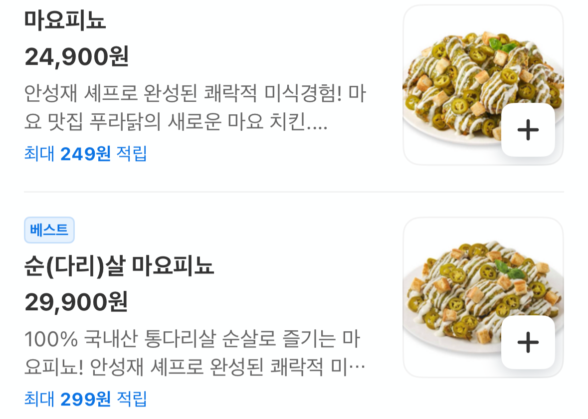 | 일부 푸라닭치킨 가맹점이 배달앱에서 판매 중인 ‘마요피뇨’와 ‘순살 마요피뇨’ 가격이 5000원 차이가 난다. [요기요 앱 갈무리] |