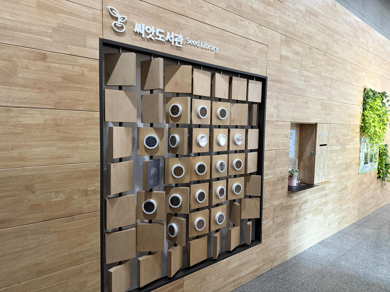 | 나무 질감 벽에 씨앗도서관이라고 적힌 간판과 씨앗 견본들이 전시된 모습이다. 액자형 틀 안에 나무 재질의 작은 정육면체 상자들이 규칙적으로 배열되어 있고, 각 상자 안에는 씨앗 견본들이 담겨 있다. |