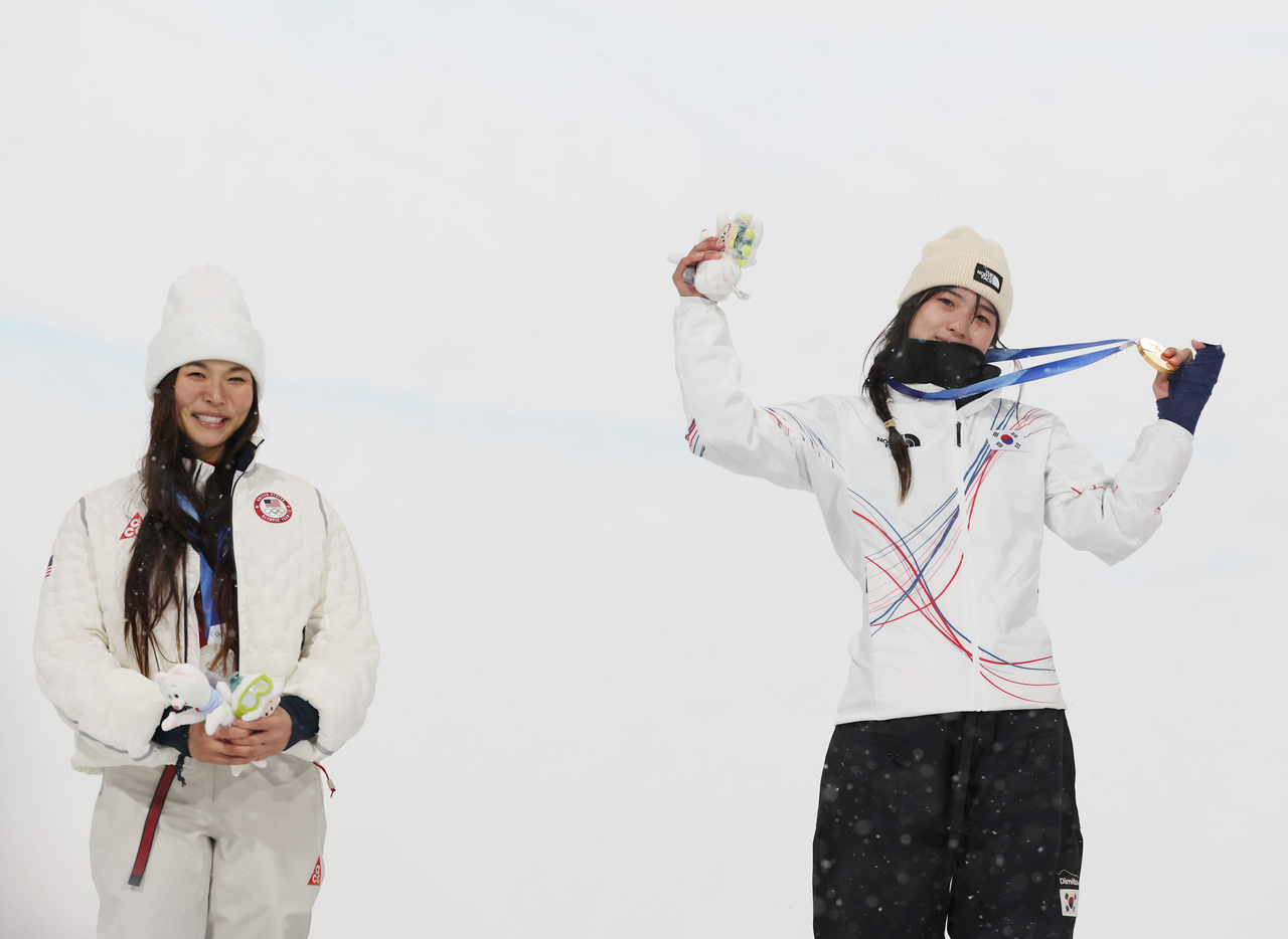 | 12일(현지시간) 스노보드 여자 하프파이프 결승에서 금메달을 따낸 최가온이 메달을 목에 걸고 손을 흔들고 있다. 왼쪽은 은메달을 차지한 미국의 클로이 김. [연합] |
