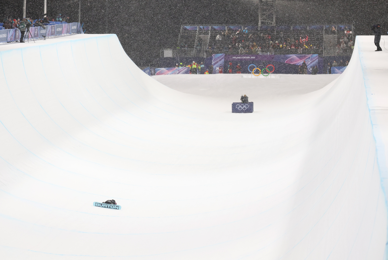 | 12일(현지시간) 이탈리아 리비뇨 스노파크에서 열린 2026 밀라노-코르티나담페초 동계올림픽 스노보드 여자 하프파이프 결승에서 최가온이 1차시기 크게 넘어져 일어나지 못하고 있다. [연합] |
