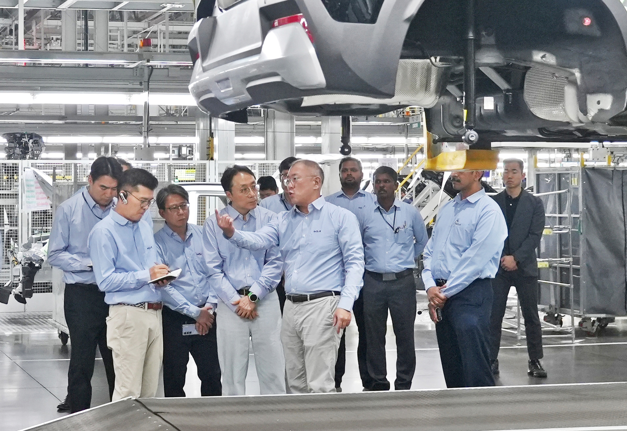 | 정의선 현대차그룹 회장이 기아 인도 아난타푸르공장 임직원들과 함께 생산 라인을 점검하고 있다. [현대차그룹 제공] |