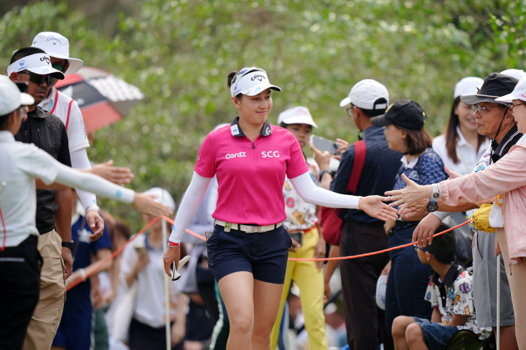 | 지노 티띠쿤(태국)이 지난 해 2월 23일 태국 촌부리 시암 컨트리 클럽에서 열린 혼다 LPGA 타일랜드 2025 최종 라운드에서 4번 홀 티잉 그라운드로 이동하던 중 팬들과 하이파이브를 하고 있다. [게티이미지] |
