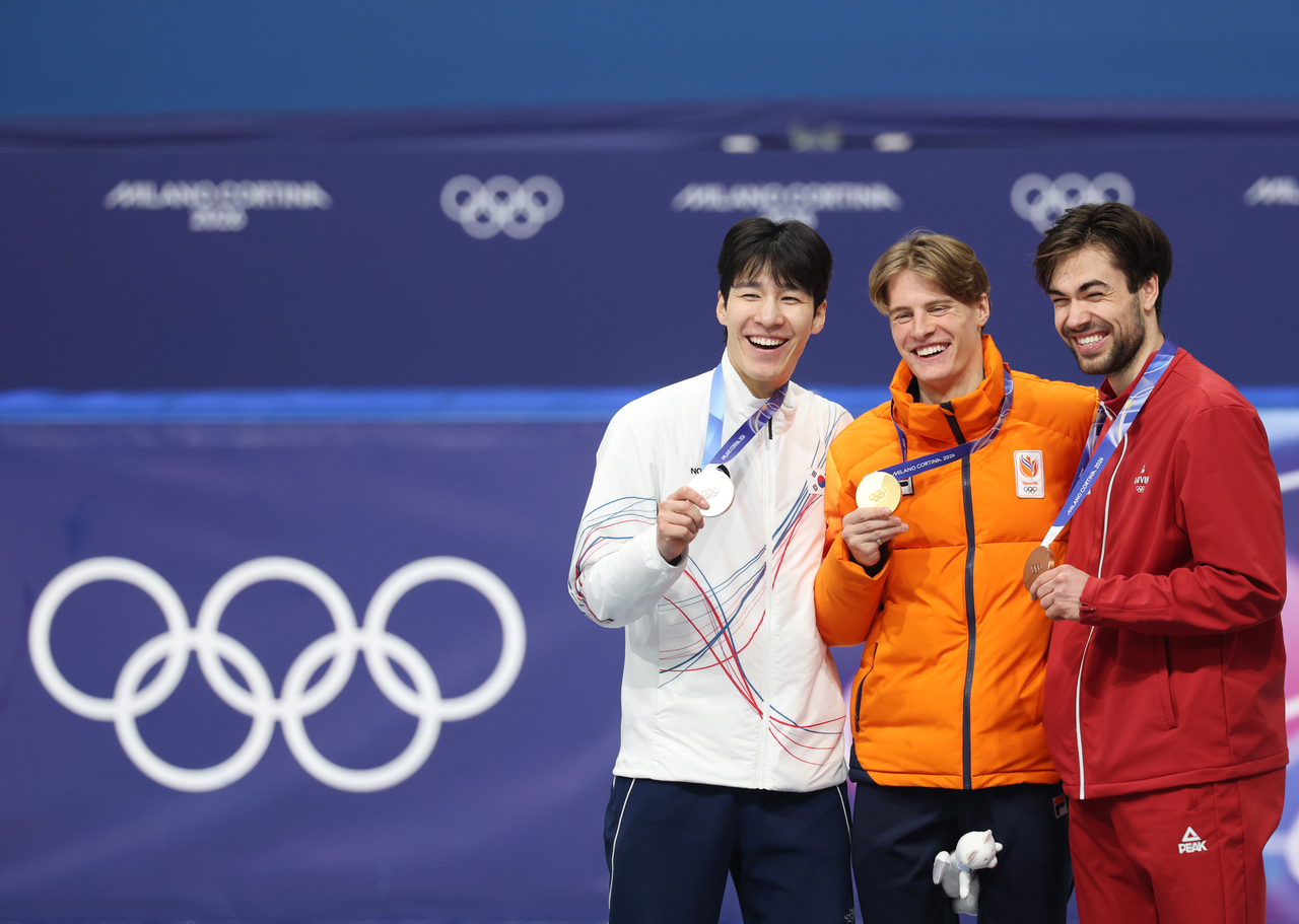 | 15일 이탈리아 밀라노 아이스스케이팅 아레나에서 열린 2026 밀라노-코르티나 동계올림픽 쇼트트랙 남자 1500m 결승에서 은메달을 따낸 황대헌(이하 왼쪽부터)이 금메달 옌스 반트바우트(네덜란드), 동메달 로버츠 크루즈버그(라트비야)와 기념촬영을 하고 있다. [연합] |