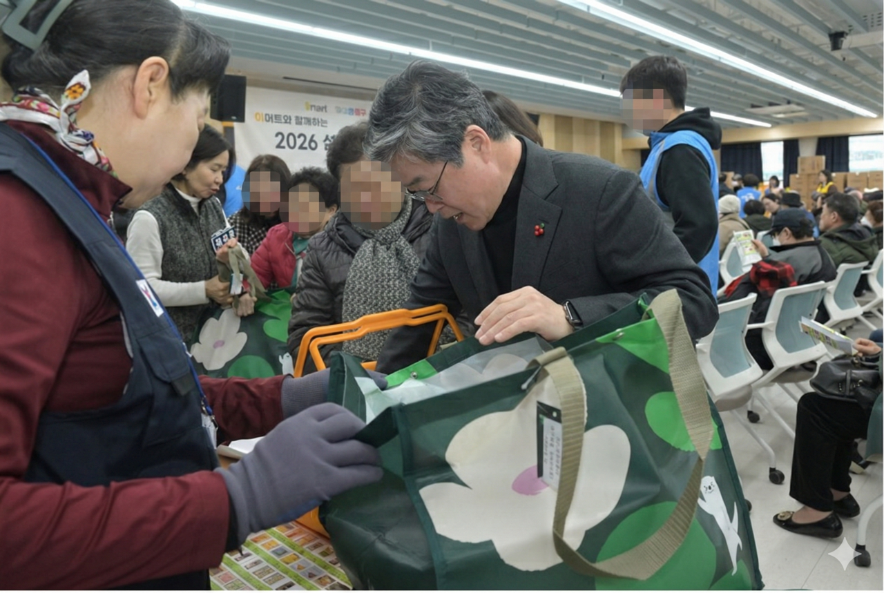 이날 행사는 지역 내 취약계층 500가구에 설 준비 식료품을 지원하기 위해 마련, ㈜이마트가 2500만 원 상당의 물품을 후원했다.