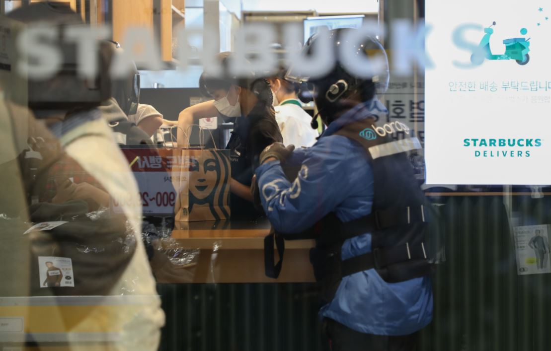 | 서울 강남구 역삼동 스타벅스 매장에서 배달 서비스가 이뤄지는 모습. [연합] |