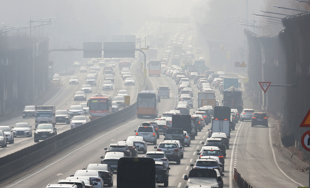 | 설 연휴 첫날인 14일 경부고속도로 서울 잠언 IC 인근이 서울을 빠져나가는 하행선 차량(오른편)으로 붐비고 있다. [연합] |