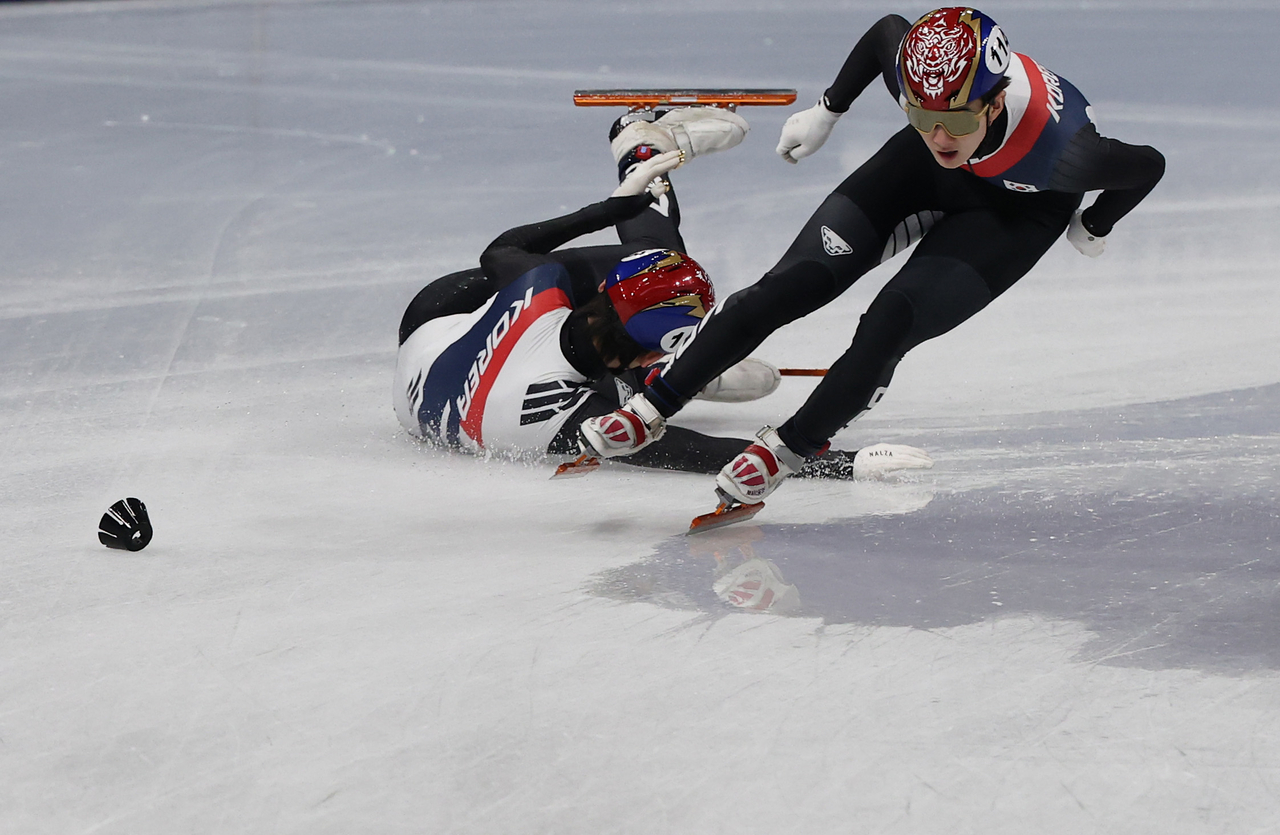 | 15일(현지시간) 이탈리아 밀라노 아이스스케이팅 아레나에서 열린 2026 밀라노-코르티나 동계올림픽 쇼트트랙 남자 1500m 준준결승에서 임종언이 넘어지고 있다. 앞서 달리는 선수는 신동민. [연합] |