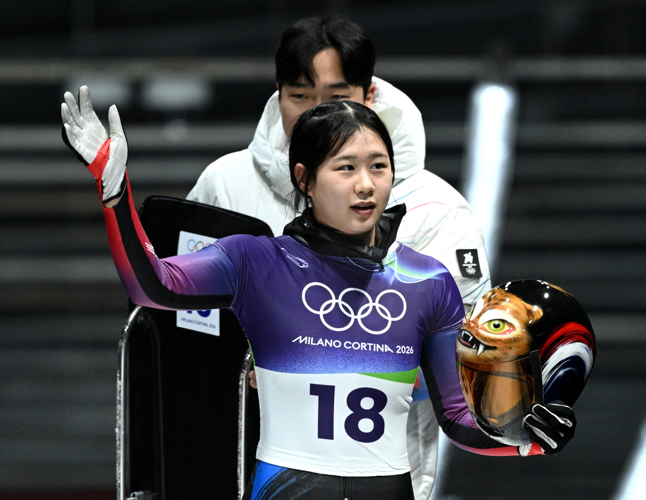 | 15일 이탈리아 코르티나 담페초의 코르티나 슬라이딩 센터에서 열린 경기에서 대한민국의 홍수정이 자신의 주행을 마친 뒤 손을 들어보이고 있다. [연합] |