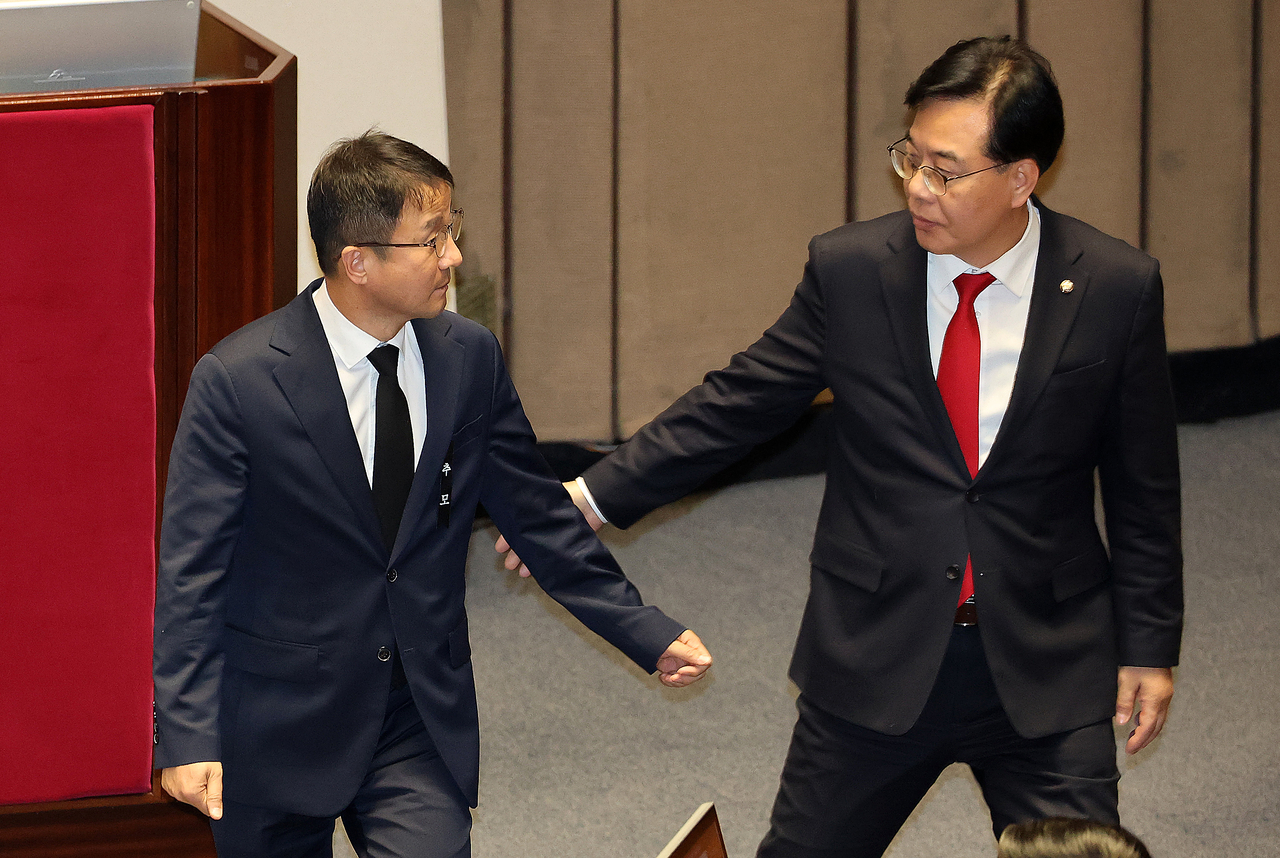 | 한병도 더불어민주당 원내대표와 송언석 국민의힘 원내대표가 1월 29일 국회에서 열린 제431회 국회(임시회) 제2차 본회의에서 대화하고 있다. [연합] |